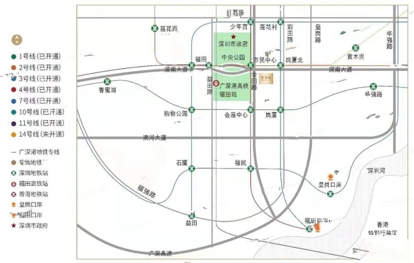 周边交通:高铁:福田高铁站——亚洲最大、全球通车速度最快的地下高铁站;口岸:福田口岸、皇岗口岸2大超级口岸;