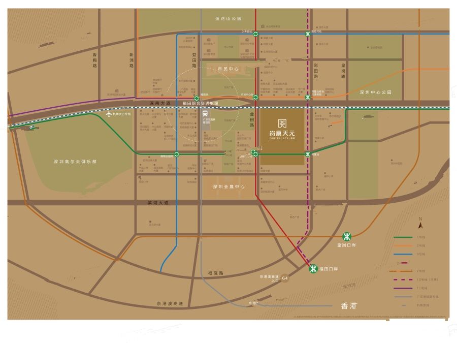 - 交通高铁:福田高铁站——亚洲**大、全球通车速度**快的地下高铁站,是全球四大湾区中**位于城市CBD中心的高铁站 口岸:福田口岸、皇岗口岸2大超级口岸地铁:8条地铁线,1号线罗湖-机场、2号线莲塘-赤湾、3号线福保-双龙、4号线福田口岸-牛湖、7号线西丽湖-太安、10号线福田口岸-双拥街、11号线福田-碧头、14号线(施工中,岗厦北-沙田) 道路:紧邻2条城市东西干道(深南大道和滨河大道),北临深南大道,南至福华三路,东西分沿彩田路和金田路,接驳深南大道、滨海大道、皇岗路,接驳北环、京港澳高速