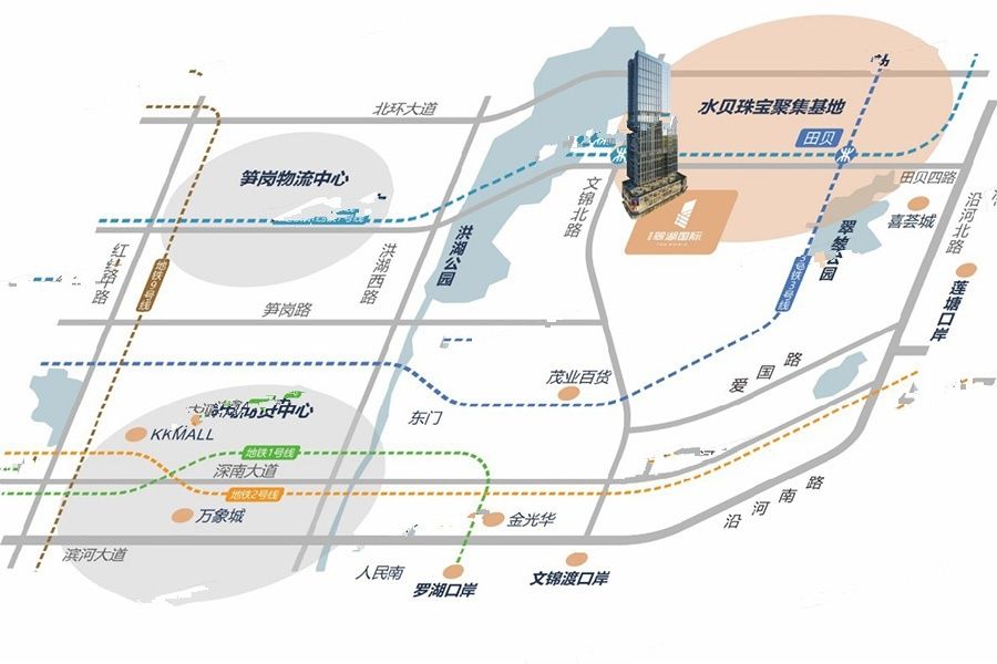 - 交通口岸:三口岸片区,距文锦渡口岸约4.5公里;距离罗湖口岸约6公里;距离莲塘口岸约5.2公里。 公交线路:田贝四路公交站,有1路、320路、333路、57路等近20条公交线。 铁路:4公里范围内有深圳火车站、深圳东站,方便到达深圳北站,实现与广州、惠州等珠三角城市快速对接。区域内未来还将建设清水河高铁站,形成南北双枢纽格局。 主干道:项目从文锦北路及田贝四路往北接驳北环大道、往南接驳深南大道,十分便利。