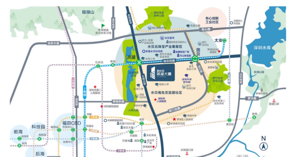 二、配套亮点:碧桂园翠湖大厦约2公里范围内有IBC环球商务中心、水贝珠宝城、沃尔玛、华润万家等商超;约5公里范围内有喜悦汇、万象城、东门老街、天虹商场、国贸商圈、京基等四大商圈。